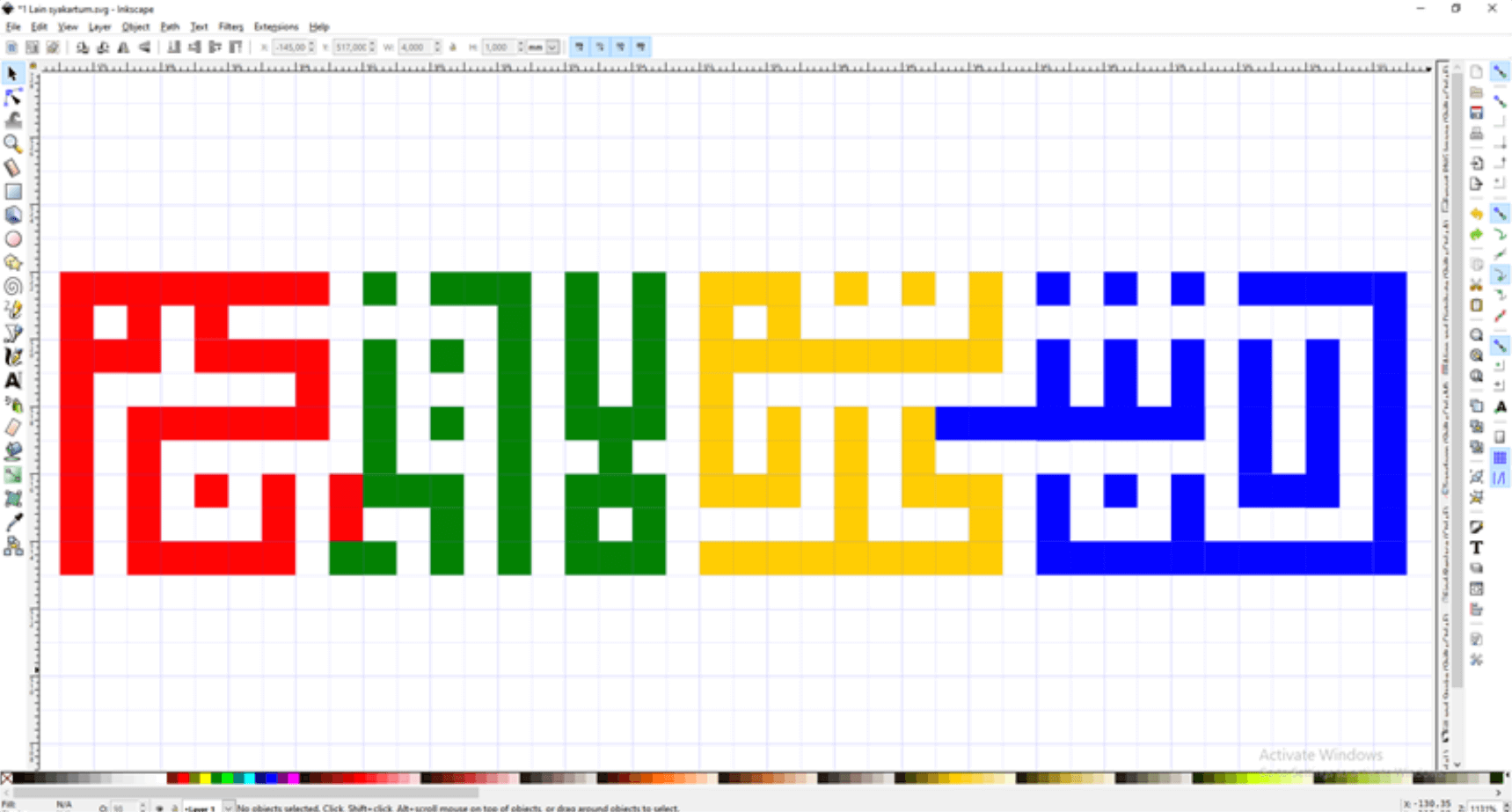 Sekarang kita akan mencoba cara untuk membuat kaligrafi dengan gaya murobba atau umumnya disebut kaligrafi kufi menggunakan aplikasi inkscape. Kaligrafi kufi adalah kaligrafi yang memiliki